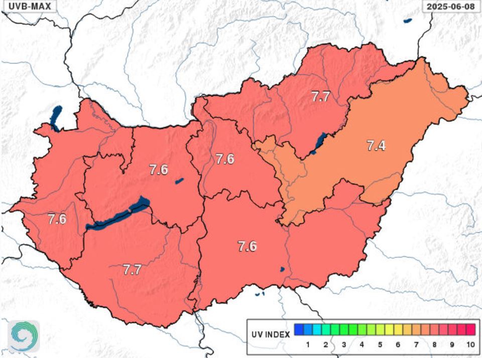 Az MTI-nek szombaton küldött figyelmeztetésben azt írták: vasárnap az UV-index várhatóan minden régióban eléri, sőt várhatóan meg is haladja a 7-es értéket, a lehetséges maximumok pedig a 8-as értéket közelíthetik.