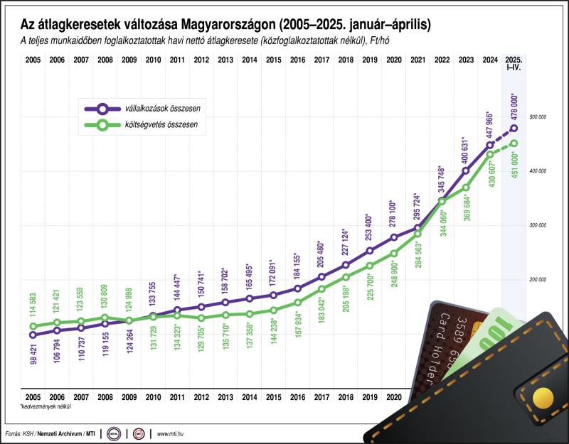 Az év első négy hónapjában (január-április) a bruttó átlagkereset 687 400 forint volt, a nettó átlagkereset pedig 472 300 forint. Ez idő alatt a bruttó kereset 9,4, a nettó kereset 9,2 százalékkal emelkedett a 2024-es adatokhoz képest.