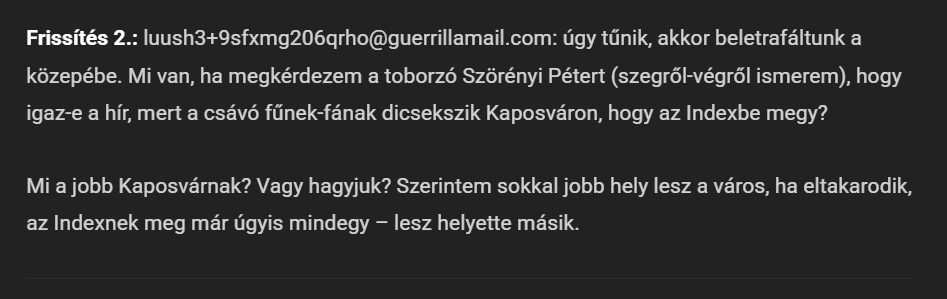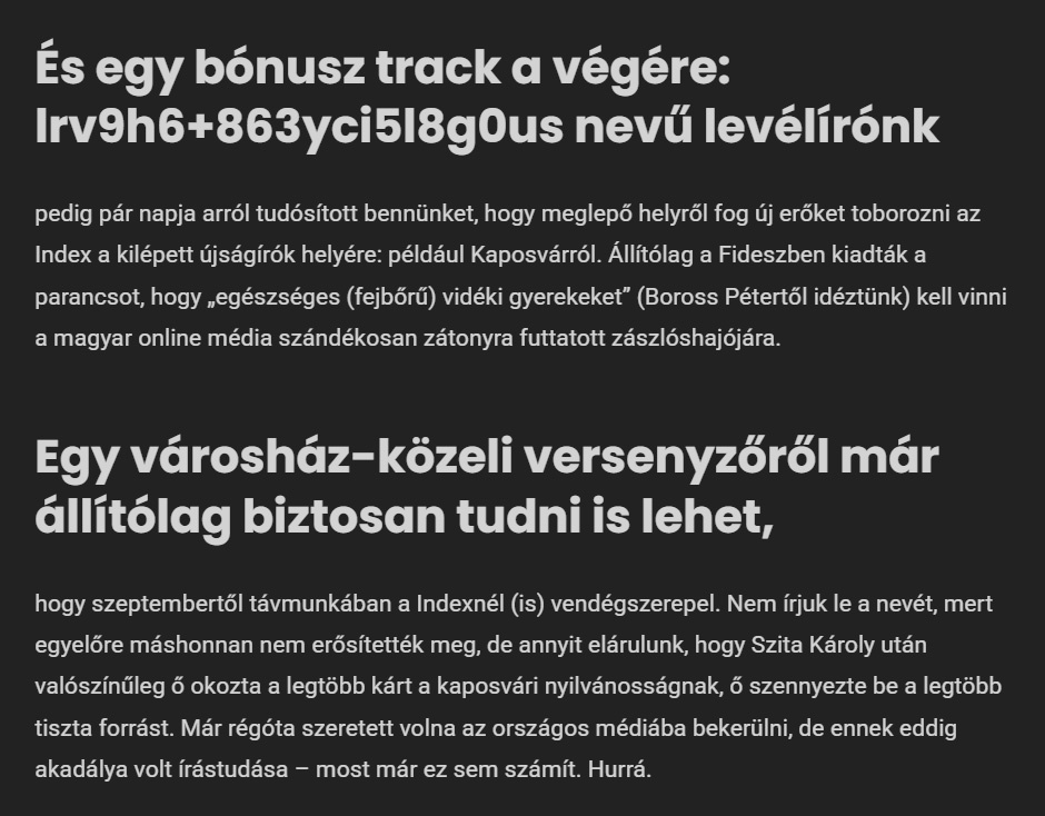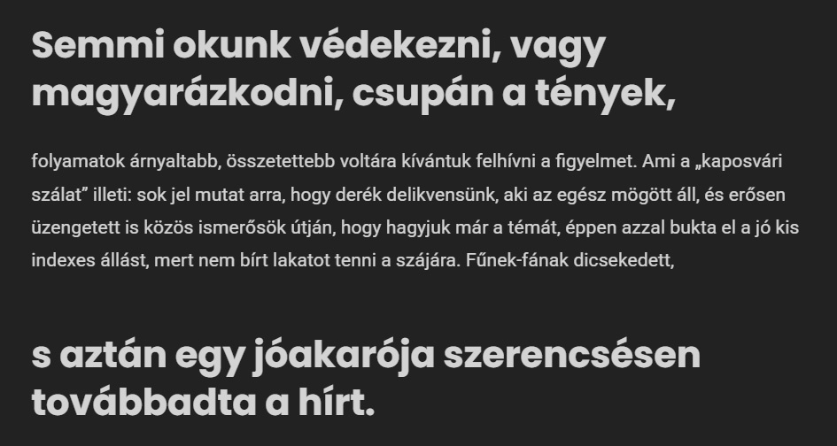 Huszka Imre inkognitóban rejtező informátorára hivatkozva akkoriban azt írta: minden NER-es (értsd: Fidesz által irányított) megyei jogú városból két-két embert kell delegálni az Index.hu kiürülő szerkesztőségébe, és Kaposvárról az egyik éppen jómagam volnék. Mint ismert, 2020-ban az országos piacvezető lap szerkesztőségi gárdája felmondott, és elindult megalapítani a Telexet. Huszka – ahogyan az lenni szokott – ezután kezdte a hamis gombhoz varrni a még hamisabb kabátot, ami aztán zakó lett. Számára.