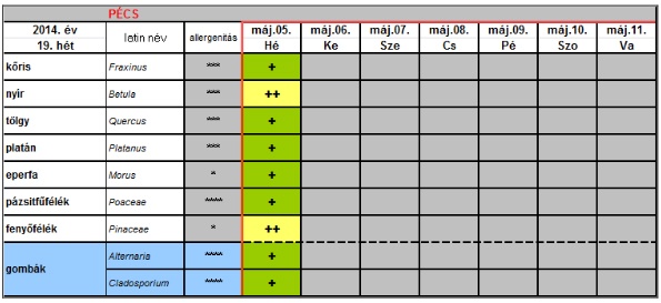 Alacsony koncentrációban előfordulhatnak még a levegőben a fűz, a dió, a vadgesztenye, valamint a ciprus- és tiszafafélék pollenszemei is. A kültéri allergén gombák koncentrációja helyenként elérheti a közepes- magas szintet is.