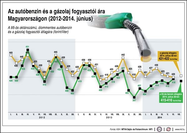 Az intézkedéssel a gázolaj literenkénti átlagára 421-422 forintra nő, a benziné 415-416 forintra mérséklődik. A Mol legutóbb múlt szerdán változtatott az árakon, akkor bruttó 3 forinttal csökkentette a benzin literenkénti nagykereskedelmi árát, a gázolajé nem változott.