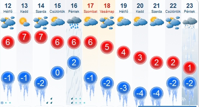 A középtávú előrejelzés szerint hétfőn napközben a Dunától keletre még több, a Dunántúlon már csak pár órás napsütés lehet, helyenként záporesőre is számítani lehet. A legalacsonyabb hőmérséklet mínusz 4 és plusz 3 fok között alakul, a kevésbé szeles délnyugati és északkeleti megyékben várható fagy. A legmagasabb hőmérséklet plusz 4-9 fok között valószínű.