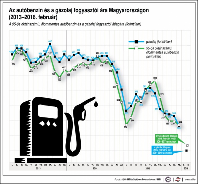 A benzinár 2012. április elején érte el csúcsát, akkor egy liter átlagosan 451 forintba került. A gázolaj literje 2012. január közepén volt a legdrágább, átlagosan 449 forint.