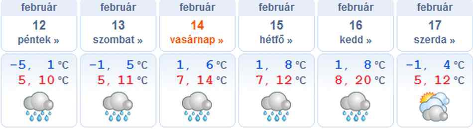 Vasárnap is erősen felhős lesz az ég, több helyen várható eső, zápor. A leghidegebb órákban plusz 1-6 fok lehet. A legmagasabb nappali hőmérséklet 7-14 fok között valószínű, délnyugaton lesz a legmelegebb - olvasható az előrejelzésben.