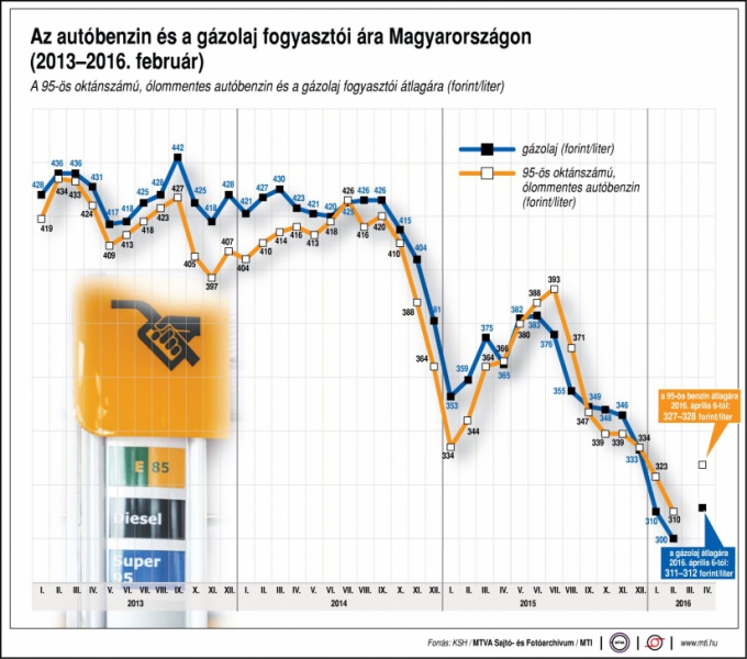 A benzinár 2012. április elején érte el csúcsát, akkor egy liter átlagosan 451 forintba került. A gázolaj literje 2012. január közepén volt a legdrágább, átlagosan 449 forint. Azóta az üzemanyag ára folyamatosan csökkent.