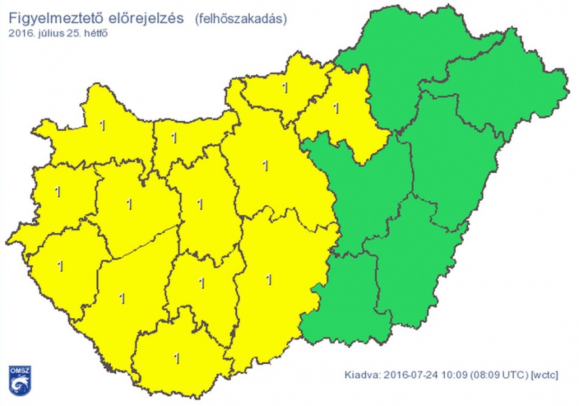 Hétfőn a Tiszántúlon várható több napsütés. A Dunántúlon többfelé, másutt helyenként záporra, zivatarra is számítani lehet. A Tiszától nyugatra eső területeken felhőszakadás is lehet. A felhőszakadás veszélye miatt tizenhárom megyére - Pest, Baranya, Bács-Kiskun, Fejér, Győr-Moson-Sopron, Heves, Komárom-Esztergom, Nógrád, Somogy, Tolna, Vas, Veszprém, Zala - és a fővárosra elsőfokú figyelmeztetést is kiadott hétfőre a meteorológiai szolgálat. Ezeken a területeken az intenzív záporokból, zivatarokból rövid idő alatt 25-30 milliméternél is több eső hullhat.