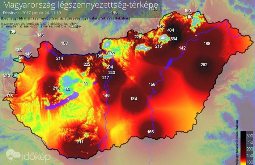 Kedden az OKK térképén tizenegy település - Budapest, Tököl, Vác, Szolnok, Eger, Salgótarján, Miskolc, Sajószentpéter, Kazincbarcika, Putnok, és Hernádszurdok - szerepelt a veszélyes levegőminőséget jelző piros színnel.
