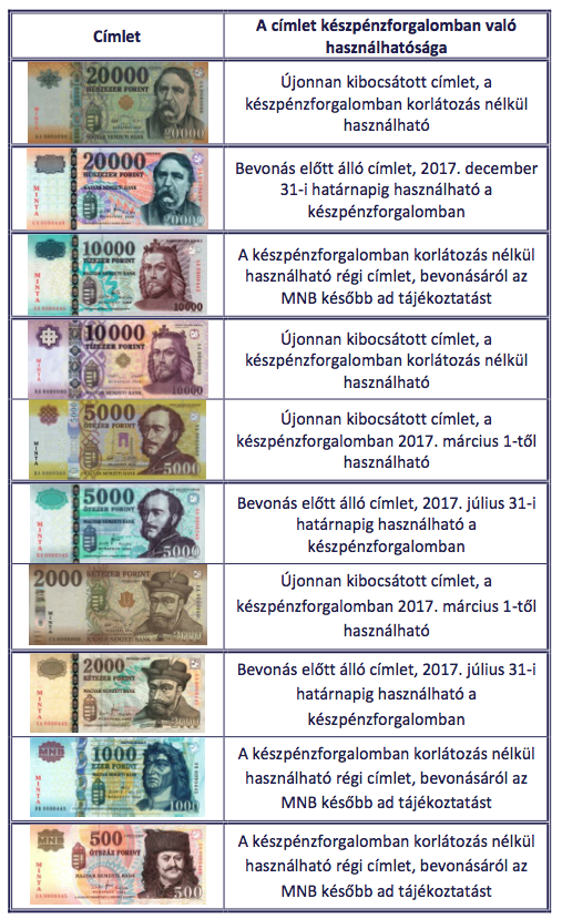 Az MNB lakossági pénztára folyamatosan, díjmentesen és korlátozások nélkül váltja át a régi 20 000 forintos bankjegyeket, 2017. március 1-től pedig a régi 2000 és az 5000 forintos címleteket is.