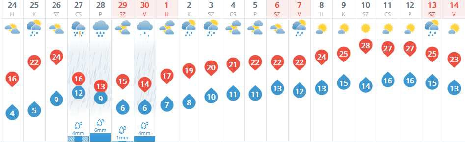 Csütörtökön a nap első felében a Dunától keletre süthet ki több órára a nap. Nyugat felől viszont erősen megnövekszik a felhőzet, estére mindenütt beborul az ég. Egyre többfelé várható eső, zápor, néhol zivatar. A Dunántúlon többfelé megerősödik a szél is. A leghidegebb órákban 6-11 fok lehet. A nappali maximumok a Dunántúl északnyugati felén 9-14, másutt 16-22 fok között alakulnak, de délkeleten még 24, 25 fok is lehet.