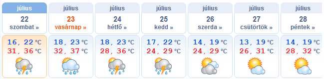 Szombaton a kánikula mellett több helyen záporok, zivatarok hozhatnak átmeneti felfrissülést. Egy-egy intenzív zivatart viharos szél és jégeső is kísérhet. A Dunántúlon néhol megélénkülhet a délies szél. A csúcshőmérséklet 32 és 37 fok között alakul. Nem várható fronthatás.