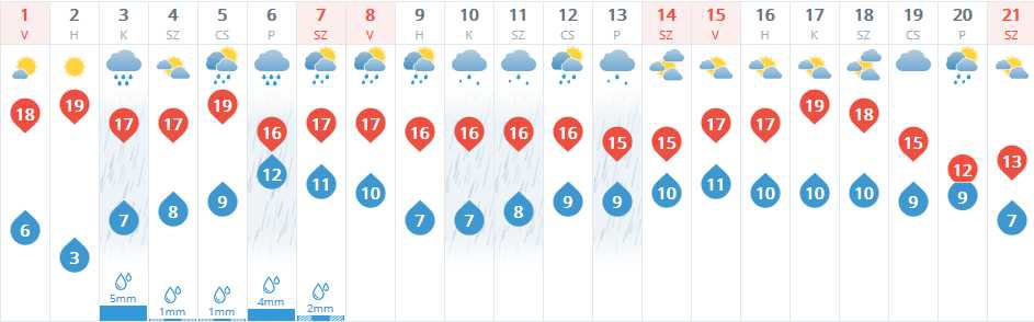 Szombaton és vasárnap változóan felhős idő várható elszórtan kisebb esővel, de több-kevesebb napsütés is várható. Szombaton a leghidegebb órákban 6-11, vasárnap 5-10 fok lehet. A nappali maximumok szombaton 12-17, vasárnap 13-18 fok között alakulnak - olvasható az előrejelzésben.