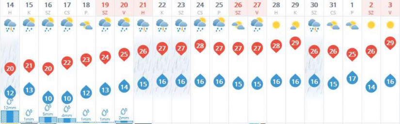 Szombaton és vasárnap szórványosan várható zápor, zivatar. A szél megerősödik, zivatar környezetében viharossá is fokozódik. Szombaton a legalacsonyabb hőmérséklet 9-14, vasárnap 11-16 fok között alakul. Szombaton napközben 21-27, vasárnap 22-28 fokig melegszik a levegő - olvasható az előrejelzésben.
