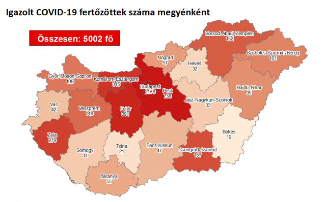 5002 főre nőtt a hazánkban beazonosított fertőzöttek száma. Az elhunytak száma változatlanul 609 fő, 3665-en pedig már meggyógyultak. Az aktív fertőzöttek száma 728 fő.