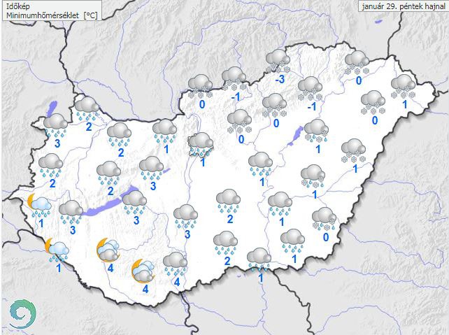 A napokban tapasztalthoz képest kevésbé hideg, de csapadékosabb idő várható január utolsó hétvégéjén. Eső, néhol átmenetileg ónos eső és havazás is várható – derül ki az Országos Meteorológiai Szolgálat országos, középtávú előrejelzéséből.