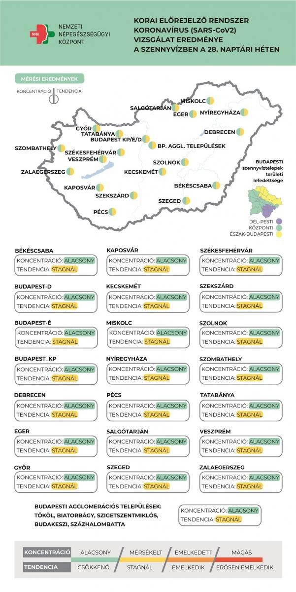 A 28. héten továbbra is alacsony szinten stagnál a vizsgált helyszínek szennyvíz mintáiban a SARS-CoV-2 koronavírus koncentrációja, emelkedés egyik településen sem tapasztalható.