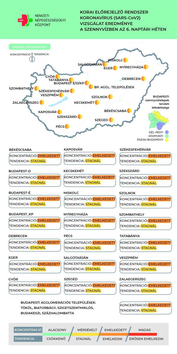 A közleményben kiemelték, a kommunális szennyvízben a koronavírus örökítőanyagának koncentrációja országos átlagban továbbra sem mutat változást, értéke magas szinten stagnál. Számottevő emelkedés vagy csökkenés egyik vizsgálatba vont város esetében sem tapasztalható.