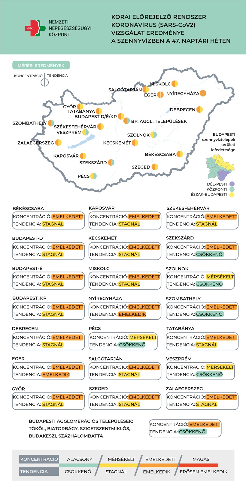 Azt írták: a szennyvízben mért koronavírus-örökítőanyag koncentrációja országos átlagot tekintve ismét stagnál a 47. héten. A vizsgált városok többségét stagnáló tendencia jellemzi, emelkedés Egerben és Nyíregyházán látható, míg csökkenés a Budapest környéki agglomerációs települések közös mintájában (Tököl, Biatorbágy, Szigetszentmiklós, Budakeszi, Százhalombatta), valamint Pécsett, Szekszárdon, Szolnokon, Szombathelyen és Veszprémben figyelhető meg – tették hozzá.
