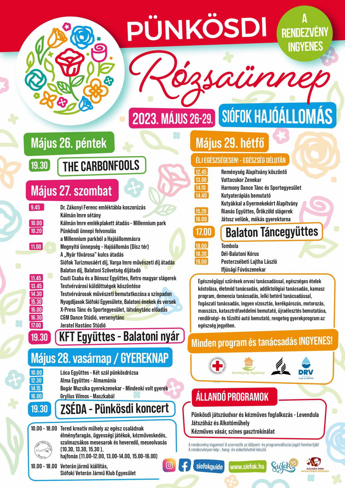 A május 26-29. közötti siófoki rendezvényen családi és gyerekprogramok, kreatív műhely, veterán jármű kiállítás, Alma Együttes és Gryllus Vilmos- gyermekkoncert is lesz. Pénteken fellép a The Carbonfools zenekar, szombat este a siófoki kötődésű KFT Együttes, vasárnap pedig Zséda ünnepi koncertje következik a Rózsakert szomszédságában.