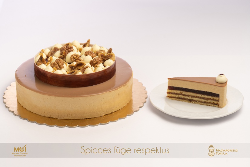 Elmondása alapján a Spicces füge respektus mandulalisztes vajas joconde-felvertből, lágy sóskaramellás mousse-ból és diós-karamellás ropogósból épül fel, és kakaóbab-töretet is tartalmaz. A tokaji aszús, meggyes fügezselé és az akácmézes tejcsokoládé tükörzselé által biztosított ízeket akácmézes fehércsokis ganache és diós sablé-korong koronázza meg. A spicces jelző a fügezselé bortartalmára utal, ám a kész tortában nem marad alkohol – fűzte hozzá.