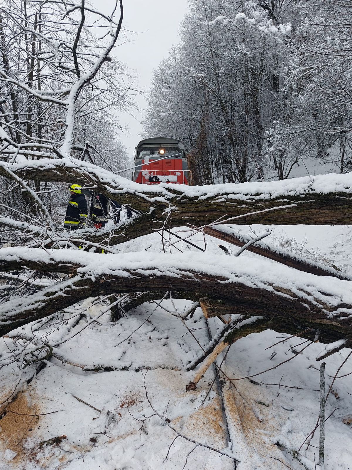 Fa dőlt a sínekre a havazás, a hó súlya miatt Porvacsesznek állomás közelében szombaton, a Zirc felé eső részen.