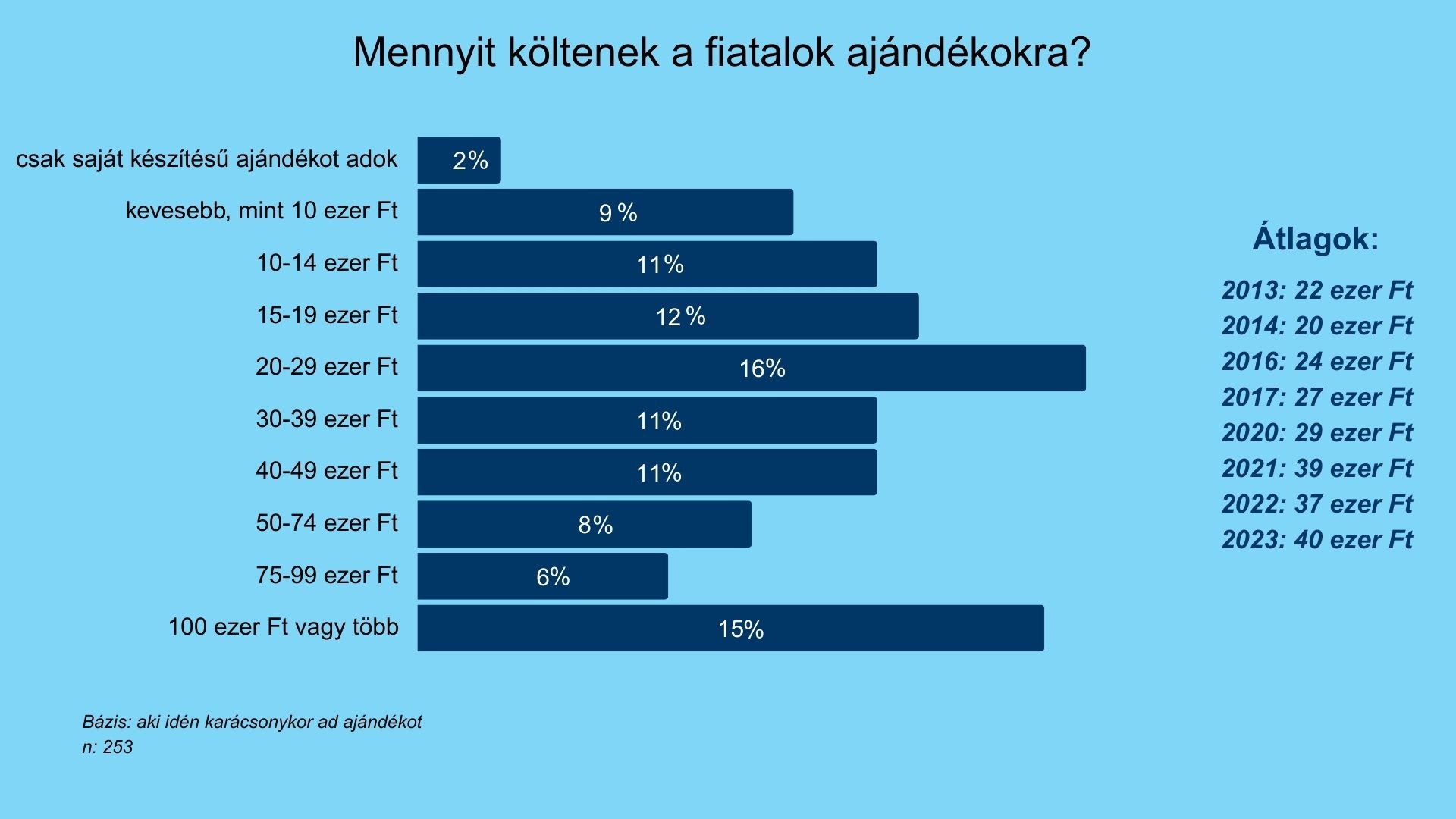 Az elmúlt évek adatai alapján jól látható, hogy a fiatalok ajándékokra szánt költségvetése fokozatosan emelkedik. 2021-ben jelentős ugrás volt tapasztalható, amikor a 2020-as 29 ezer forintról 39 ezer forintra nőtt az átlagösszeg. Ezt követően 2022-ben 37 ezer forintra csökkent, majd tavaly 40 ezer forintra emelkedett, idén pedig már 49 ezer forintot terveznek ajándékokra költeni.