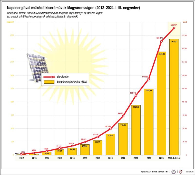 Magyarországon már több mint 300 ezer naperőmű üzemel, és a háztartási napelemes rendszerek száma is hamarosan eléri ezt a mérföldkövet – jelentette be az Energiaügyi Minisztérium. Az ország napenergia-termelése európai szinten is kiemelkedő, a megtermelt energia egynegyede naperőművekből származik.