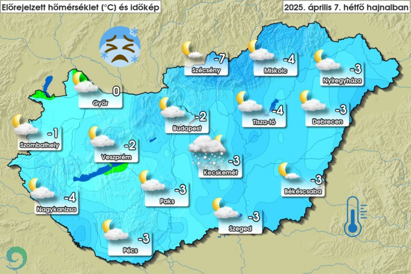 Hozzátették, hogy inkább csak a vízpartok mentén, a nagyobb városok belsejében, illetve kisebb körzetekben a szelesebb északnyugati határvidékeken maradhat pozitív tartományban a hőmérséklet, míg a hidegre érzékeny mikroklímájú helyeken mínusz 5 Celsius-fok alá, akár mínusz 7, mínusz 8 fokig hűlhet a levegő.
