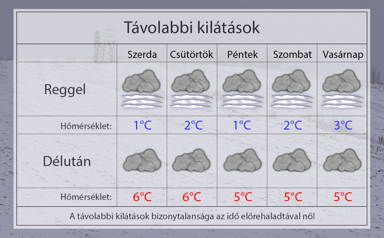 A hét második felében is marad a szürkeség, de talán lesznek olyan helyek, ahol néha felszakadozik a ködmező. Délutánonként a levegő 5°C környékére melegszik, míg reggelente fagyponthoz közeli hőmérsékletekre lehet számítani.