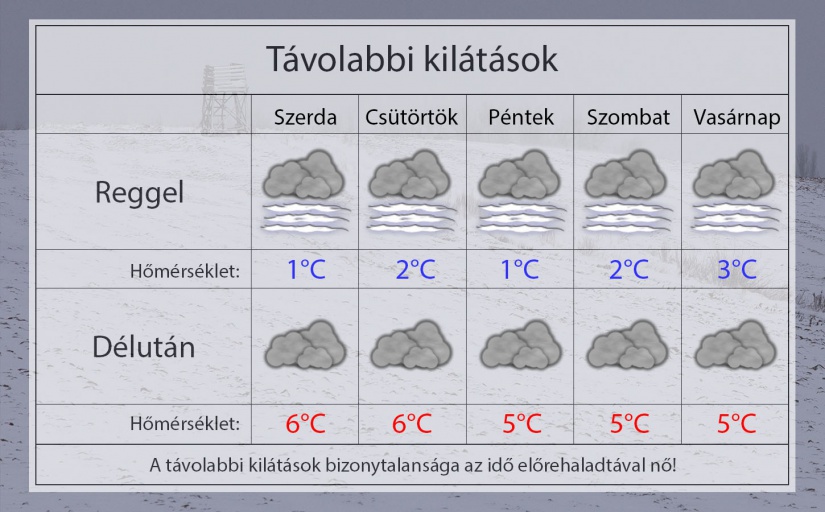 Szerda reggelre a borongós, párás idő lesz 1°C-ban. Délután már marad a sok felhő és a párásság. 6°C-ig melegszik a levegő. Gyenge déli szél fúj majd.