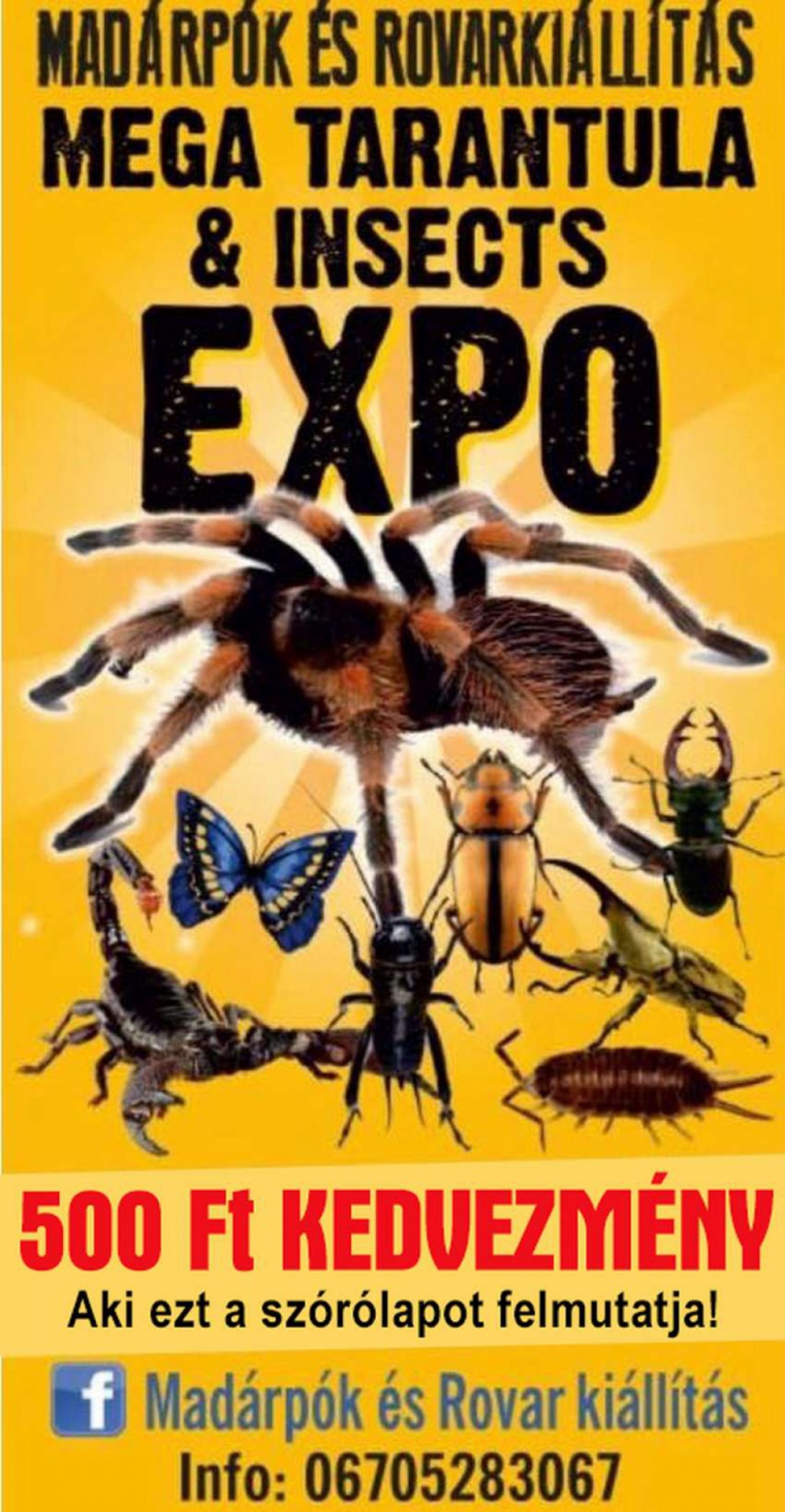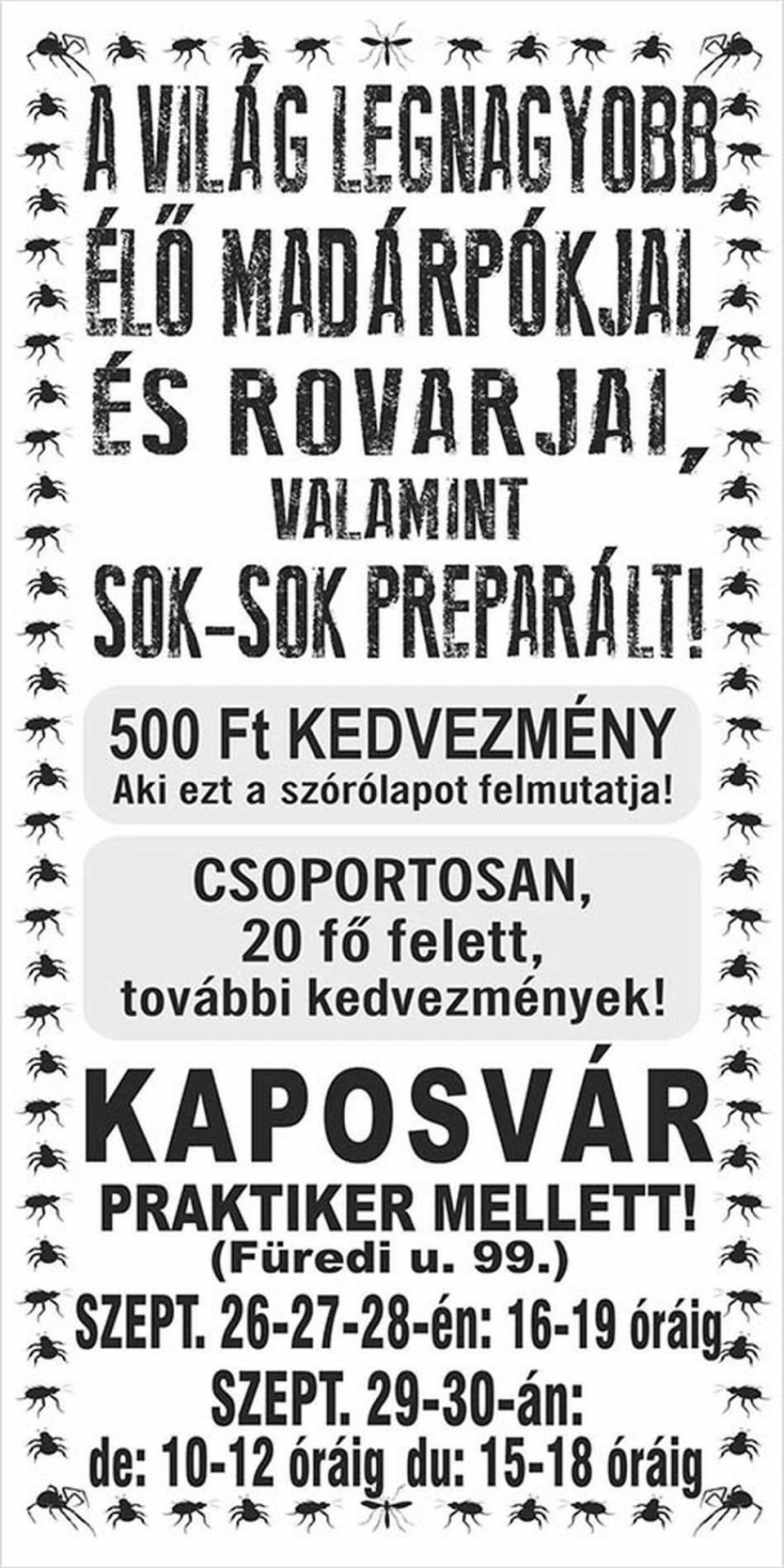 A világ legnagyobb, tányér nagyságú madárpókjai, óriás botsáskák, 5 kontinens egzotikus óriás rovarjai Kaposváron, a Praktiker parkolóban lévő rendezvénysátorban, szeptember 26-án, 27-én és 28-án 16-tól 19 óráig, hétvégén délelőtt 10-től délig, délután 3 órától este 6-ig.