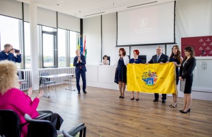 Pintér Rómeó a „Kaposvár 1873 – A felemelkedés kezdete” kiállítás megnyitóján adta át a város 150. évének emlékzászlaját.