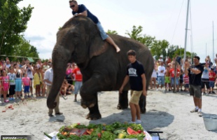 A Magyar Nemzeti Cirkusz elefántja, Szandra volt a sztárvendége az egyik balatonlellei yacht club strandnak. Gönczi Gábor és Tatár Csilla...