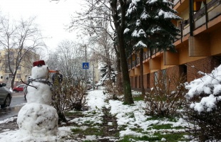 Megérkezett a tél Kaposvárra is, a Honvéd utcában a Sávház második lépcsőháza előtt egy igazi hóember vigyázza a rendet, van répa orra, bár a szemei...