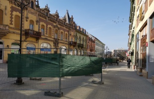 Több helyen láthatunk elkerített részt a sétálóutcán, néhány helyen már elkezdték a térkövet is felszedni. Ezekre a helyekre kőből készült kaspók...