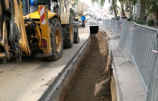 Az új távhővezetéknek helyet adó munkaárok visszatöltése zajlik a Sávház köztől az Arany János téri körforgalomig.