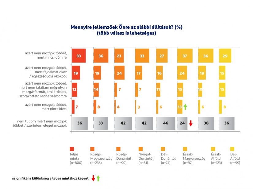 Idén májusban országos, reprezentatív felmérés zajlott 800 fő részvételével, amely a 30 év felettiek sportolási szokásait vizsgálta az egyes régiókban. A kutatásból kiderült, hogy a Dél-Alföldön és Dél-Dunántúlon élők miért mozognak kevesebbet a kelleténél: az elsődleges tényező mindkét régióban egyértelműen az időhiány (27% és 29%), bár ez elmarad az országos átlagtól, de nagyon sokan panaszkodtak a mozgással járó fájdalomra is (15%-16%). Érdekes, hogy az Alföld déli részén viszont azért sem mozognak rendszeresen, mert nem találtak számukra kedves, megfelelő sportágat. Ezzel kapcsolatban Dr. Nagy Sándor, a Magyar Nyugdíjasok Országos Szövetségének szenior mozgásszakértője hozzátette: „A rendszeres mozgás a 60 év felettiek körében még ritkább, ilyenkor már nem az időhiány az, ami akadályozza a sportot, hanem a túlsúly, a különböző betegségek, a mozgásszervi, ízületi fájdalmak. Ez egy ördögi kör, minél idősebb valaki, annál kevesebbet mozog, holott egyre inkább szüksége lenne a rendszeres testmozgásra az egészség megőrzéséhez és a mozgásszervi fájdalmak megelőzéséhez.”