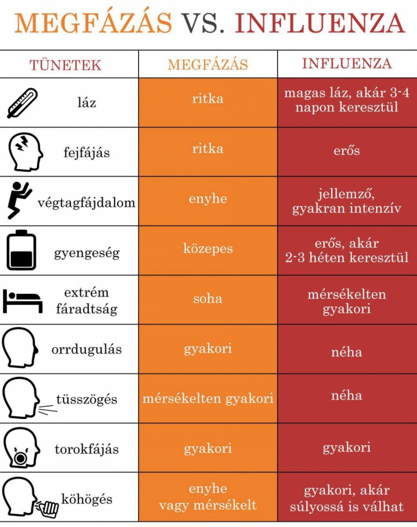 Ebben az időszakban gyakori a megbetegedések száma. Tüsszögünk, köhögünk, lázasak vagyunk vagy folyamatosan fújjuk az orrunkat, de nem mindig vagyunk tisztában azzal, hogy mi is a bajunk. A Házipatika.com táblázatban láthatjuk mi is a különbség a megfázás és az influenza tünetei között.