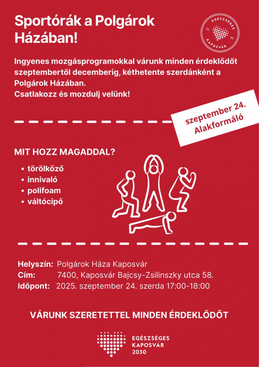 Szeptembertől decemberig ingyenes sportfoglalkozásokra invitálják a kaposváriakat a Polgárok Házában – derül ki az Egészséges Kaposvár Facebook-oldaláról.