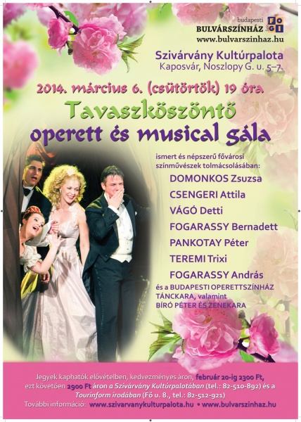 Tavaszköszöntő operett és musical gála est tánckarral, élő zenével, ismert és népszerű színművészek tolmácsolásában hamarosan Kaposváron. Az általunk meghirdetett játékban páros belépőt sorsolunk ki a helyesen válaszolók között.