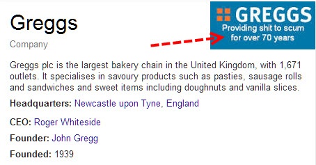Hatalmas PR-rémálmot volt kénytelen elszenvedni a Greggs brit pékséglánc, miután a cég Wikipédia oldalán a vállalkozás logójánál egy darabig az szerepelt, hogy ürüléket és szemetet adnak el már 70 éve.