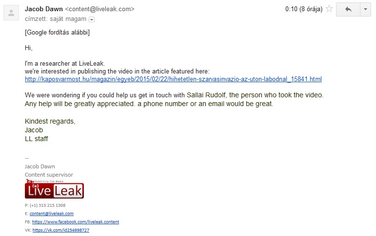 Éjfél után nem sokkal kaptunk egy emailt Jacobtól, a LiveLeak nevű külföldi videomegosztó oldal tartalomszerkesztőjétől, amiben a segítségünket kéri. Segítettünk.