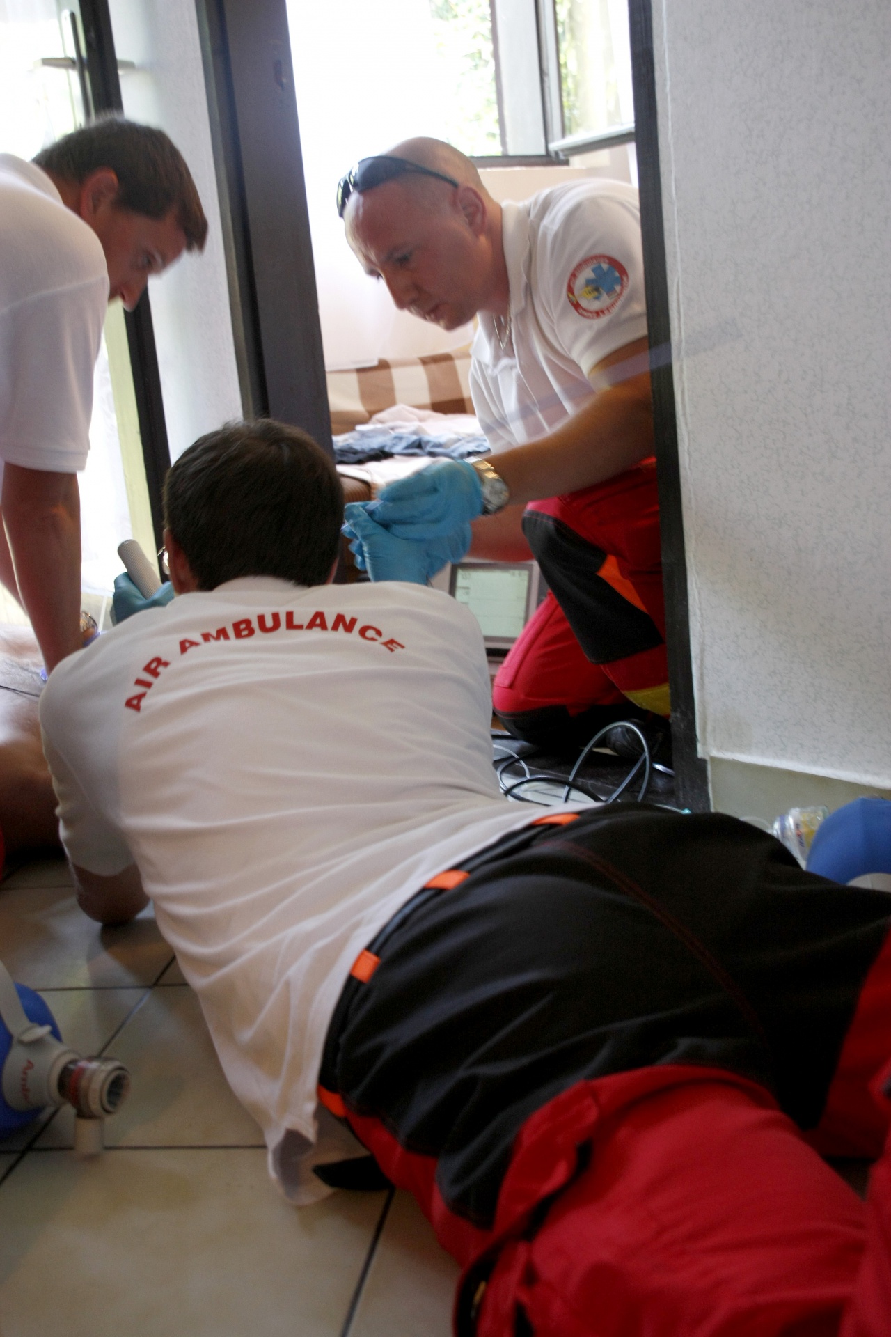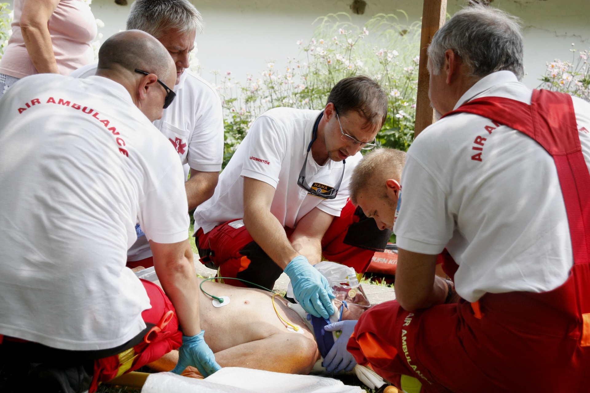 Tíz perces út állt előttünk, egy fiatal férfihoz igyekeztünk, aki összeesett az otthonában, s akinek az életéért ekkor már küzdött a földi egység. Mélységes csendben eltöltött tíz perc volt, fürkésztem Gábor tekintetét, de azok messze révedtek a távolba, láttam, hogy fejben már az előtte álló feladatra készül. Leszálltunk és azonnal kipattantunk a gépből, a csomagokkal beültünk a ránk váró rendőrautóba, ami elvitt minket egy közeli utcába. A ház emeletén olyan látvány tárult elém, amit eddig csak a kórházas sorozatokban láttam. Két fiatal mentődolgozó térdelt a férfi mellett, egyik szüntelenül nyomva annak mellkasát, másik a lélegeztetéshez szükséges ballont. Gábor folytatta a mellkas kompressziót, közben Laci csatlakoztatta a monitort, hogy látható legyen az EKG. A folyamatos egyenes vonalat nagyon jól értettem én is. Két perc után ismét váltottak, más nyomta tovább a mellkast, hallottam az ütemet segítő ritmusos számolást. Gábor intubálta a beteget, azaz emelt szintű légutat biztosított neki, a lélegeztetése ezen keresztül történt ezután. Minden összhangban történt, az orvos irányította a segítőit, áradó nyugalma biztosíték volt a többiek számára is. Sosem láttam újraélesztést ezelőtt, nem láttam még senkit így küzdeni egy másik ember életéért. Végig az arcokat figyeltem, ahogy nem adták fel, gyöngyöző homlokkal, egymást váltották a mellkas kompresszióban egészen addig, amíg az orvosunk azt mondta, ne tegyék tovább. Ezt a csatát elvesztették. Ott, akkor megállt a levegő a helyiségben.