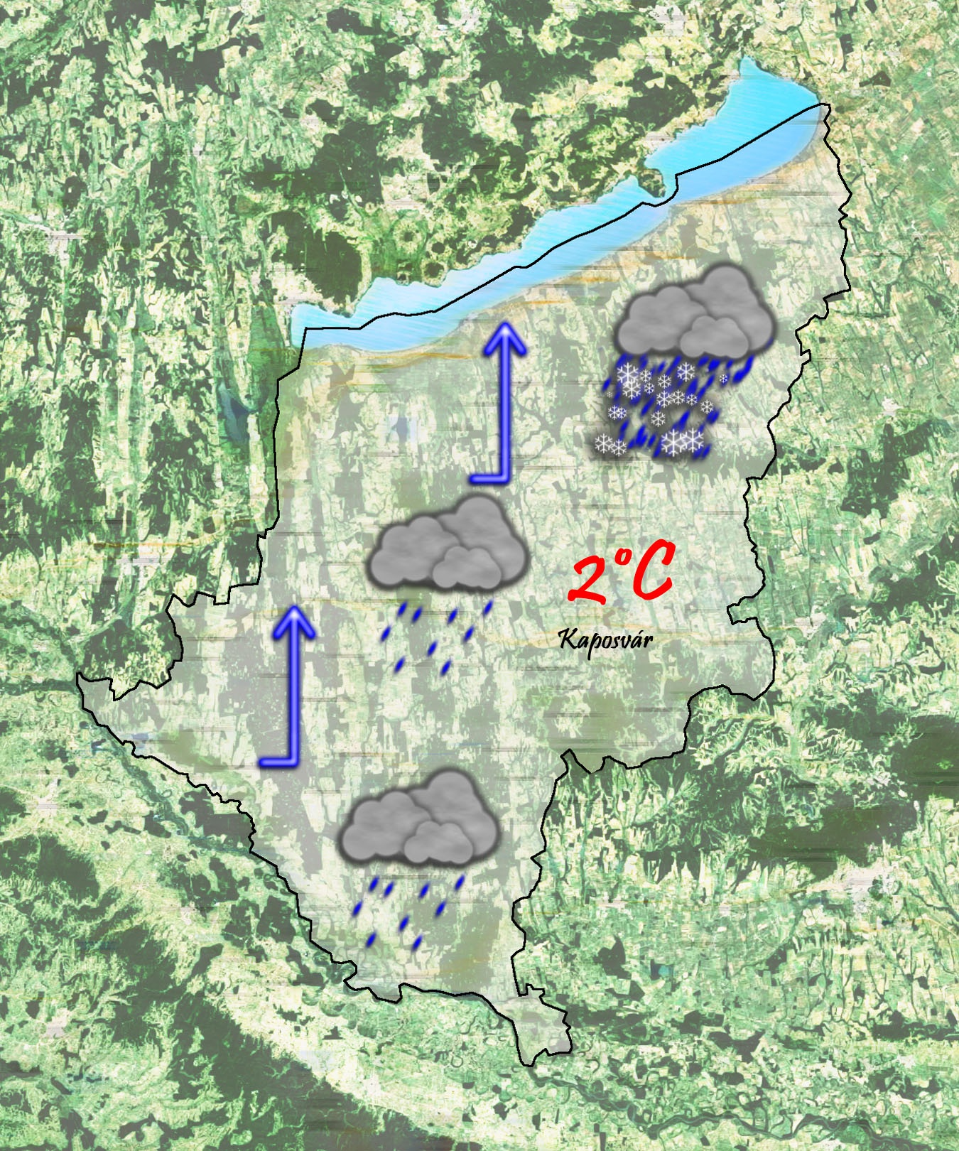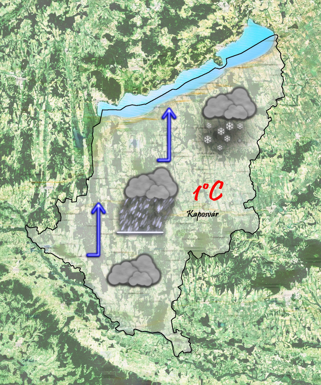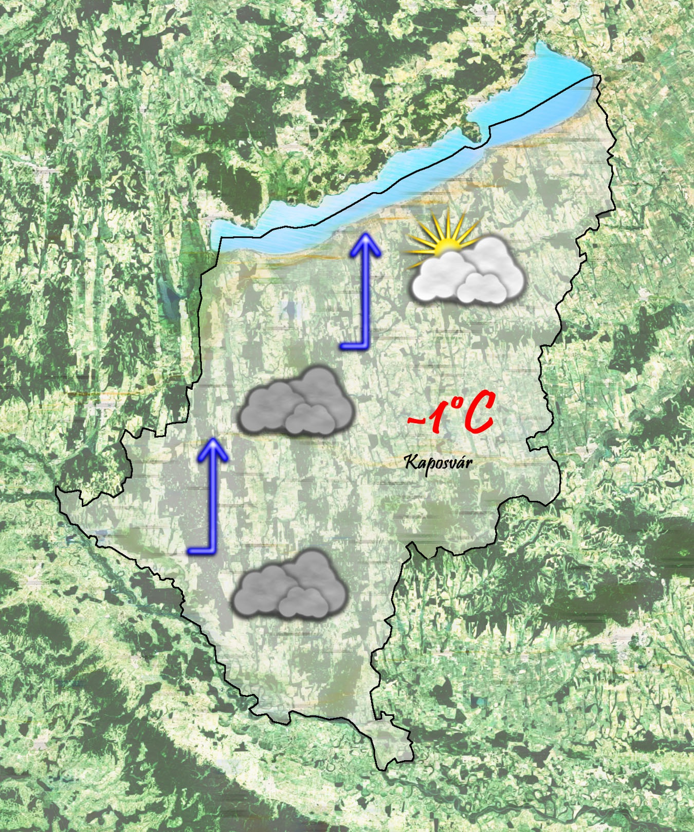 Kedd reggel -7°C-ig hűl le a levegő hőmérséklet. Egyre többfelé várható csapadék, mely eleinte havazás lesz, de a későbbiekben ónoseső és eső is eshet. Enyhülés kezdődik a délutáni órákban. Maximum 1°C-ig emelkedik a hőmérséklet.