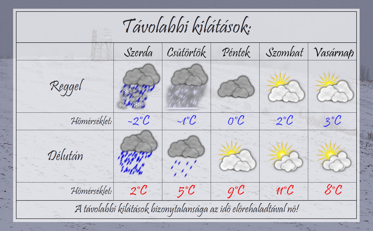 Szerdán reggel további csapadékra kell számítani, mely inkább már havaseső, eső lehet. Már csak 0°C-ig csökken a hőmérséklet. Napközben is kell számítani csapadékra. Délután a hőmérő higanyszála már túllépi a 0°C-ot. Gyenge déli szél fog fújni.