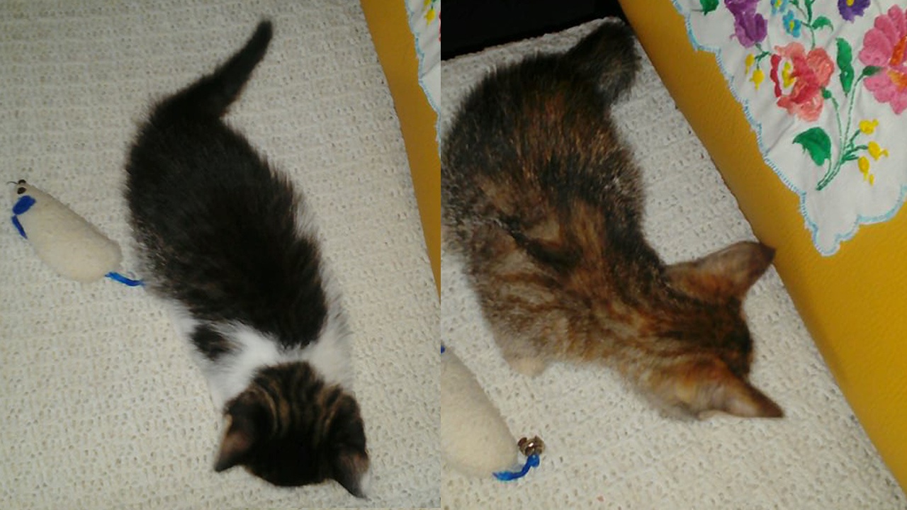 A két kislány kiscica július 5-én lesz kéthónapos, és már önállóan esznek, és nagyon játékosak is. A cicusok testvérei már szerető otthonra találtak, így, aki hasonló sorsot szeretne és tudna biztosítani ezeknek az cukiságoknak jelentkezhet a 0630 779 21 01-es telefonszámon.