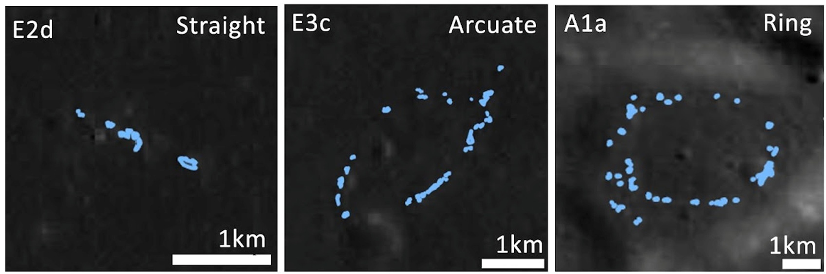 Az új térkép feltárta, hogy e szabálytalan foltok többnyire csoportokban alakulnak ki, és szabályos alakzatokat, például vonalakat vagy köröket hoznak létre más geológiai képződmények – lávával teli kráterek vagy tektonikus törések – mentén. Ez arra utal, hogy kialakulásuk a felszín alatti geológiához kapcsolódik, de többféle geológiai környezettípusban. Sok közülük a kráterek peremén helyezkedik el, ahol a lejtés és a potenciálisan vékony lávatakaró optimális környezetet biztosít ahhoz, hogy az omlási folyamatok újra induljanak. „Azt azonban továbbra sem tudjuk, hogy ezek a mintázatok egyszerre vagy hosszú idő alatt, apróbb lépésekben alakulnak-e ki” – teszi hozzá a geográfus.