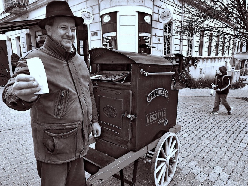 ami főleg az őszi időszakban városunkban igazi különlegesség volt, hiszen Császár Bíró János éveken keresztül árulta a Zsolnay kúttal szemben a sétálóutcán.