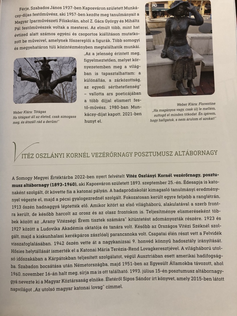 Polgári kezdeményezés nyomán a Somogy Vármegyei Értéktárba került Bozsoki János hadnagy, vitéz Oszlányi Kornél vezérőrnagy, posztumusz altábornagy és vitéz Szentgyörgyi Dezső zászlós életműve. Az ünnepélyes díjátadóra a kaposvári Vármegyeházán került sor 2023. január 10-én, ahol a leszármazottak vehették át a rangos elismerést. Tudomásom szerint más vármegyében még nem volt katona a díjazottak között, így a Somogy Vármegyei Értéktár Bizottság volt az első, amely deklarálta, hogy egy katona kimagasló katonai pályafutása, illetve bátorsága, adott esetben önfeláldozása is méltó arra, hogy kulturális örökségünk részeként tekintsünk rá.