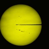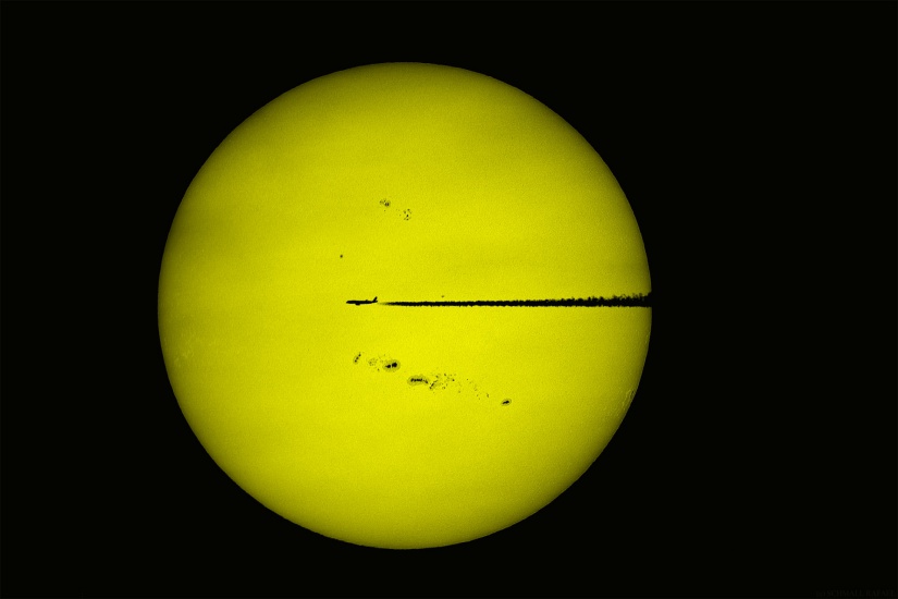 A körülbelül 80 kilométer távolságban látszódó repülő sötét sziluettként vonult el a 150 millió kilométerre elhelyezkedő napfoltok "között".
