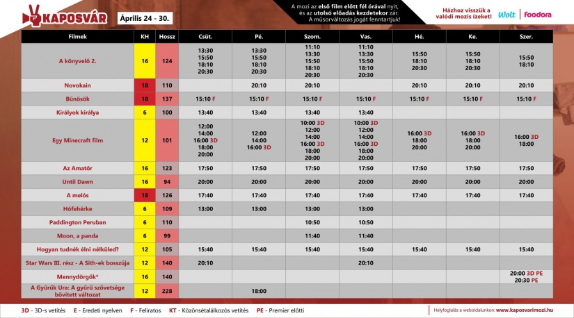 A Kultik Mozi műsora (04.23-04.30) Időpont: 2025. 04. 23., szerda, 00:00 - 2025. 04. 30., szerda, 00:00 Helyszín: Kaposvár Plaza, Kultik Mozi